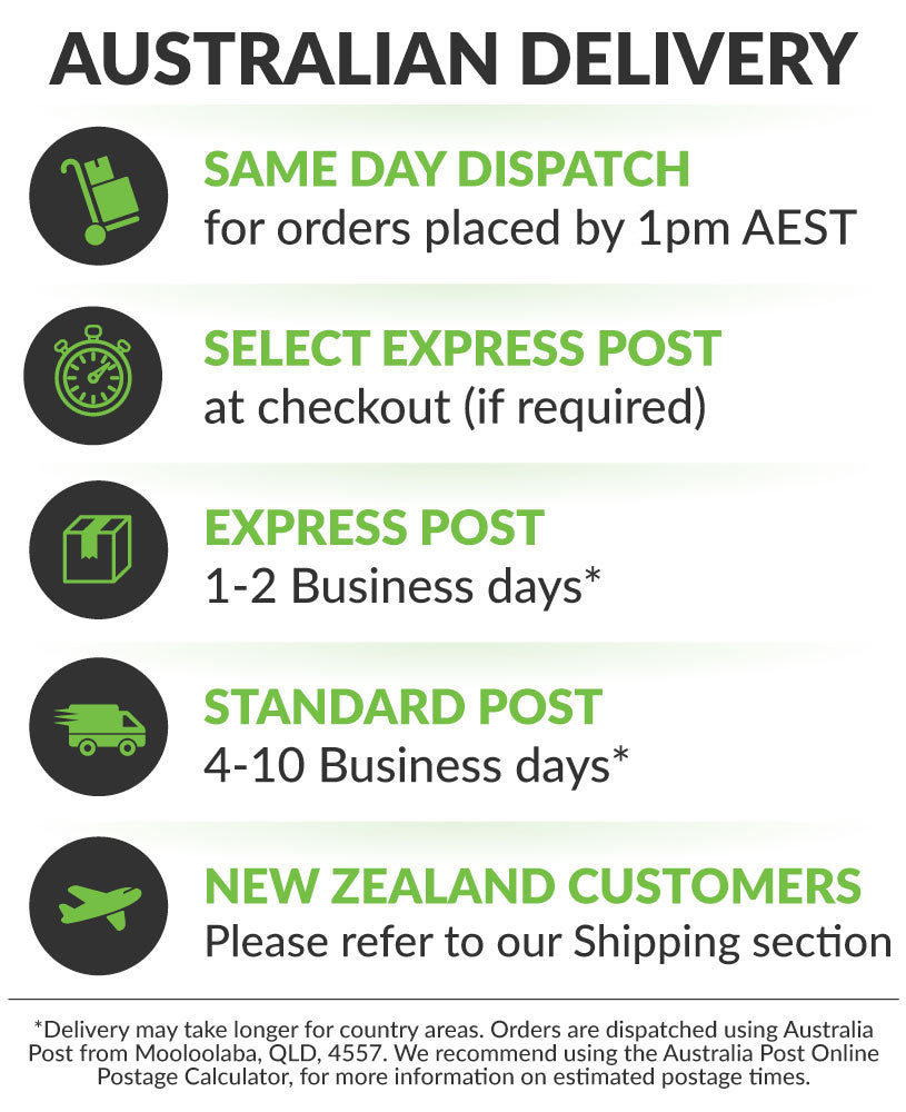Postage is sent from Mooloolaba, QLD, 4557, and we use Australia Post. This means that Post Office box addresses are most welcome. We recommend using the Australia Post website ‘Postage Calculator’ to work out how long a Standard Post delivery to your postcode will take.