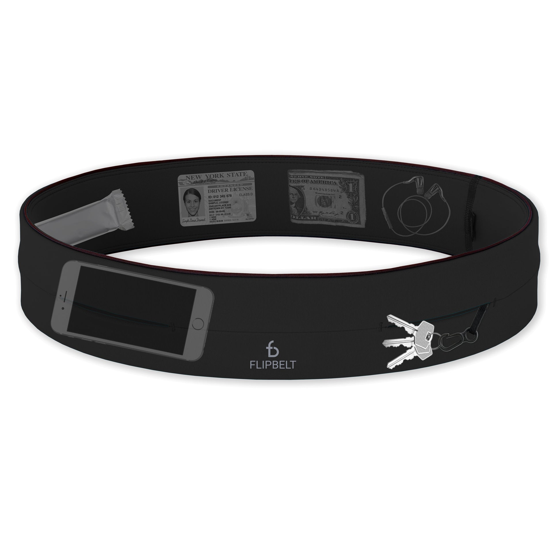 The FlipBelt classic running belt is a comfortable exercise waist belt alternative to running armbands that don't fit all your things and bulky running pouches that bounce as you move. The FlipBelt waist band for running is specifically designed to sit flat and securely on your hips without bouncing or riding up. With no buckles to pinch or cause uncomfortable chafing, simply pull FlipBelt Classic running belt on like a pair of pants, place over or under clothes, and easily slide in your stuff through the multiple openings around the exercise belt.